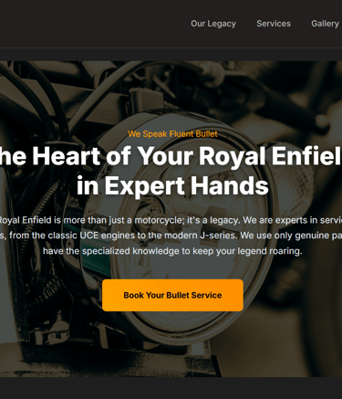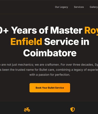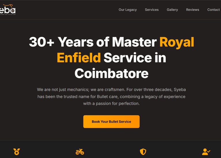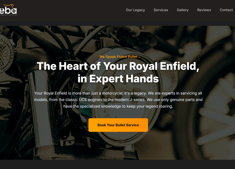 This website is a modern single-page site designed to showcase the services of Syeba Bullet Care, a trusted Royal Enfield workshop in Coimbatore. Built with a clean and user-friendly design, it highlights their decades of expertise, service offerings, and customer trust. The site enables visitors to easily explore services, view their legacy, and book appointments seamlessly.