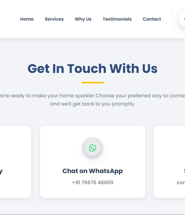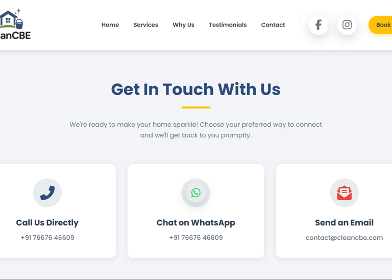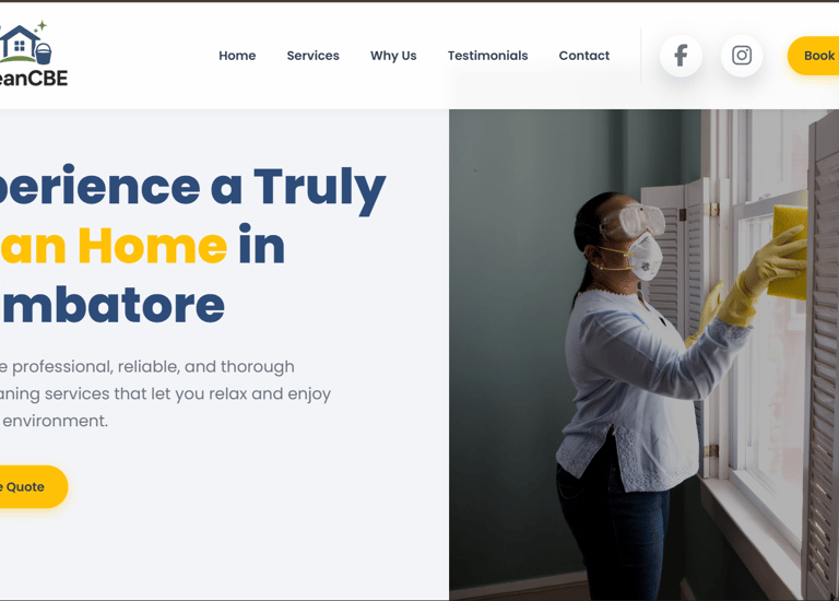 This website is a modern single-page site created to showcase the services of Clean CBE, a professional house cleaning service in Coimbatore. Designed with a simple and responsive layout, it highlights their expertise in delivering reliable cleaning solutions. The site makes it easy for visitors to explore services, request quotes, and get in touch through direct call, WhatsApp, or email seamlessly.